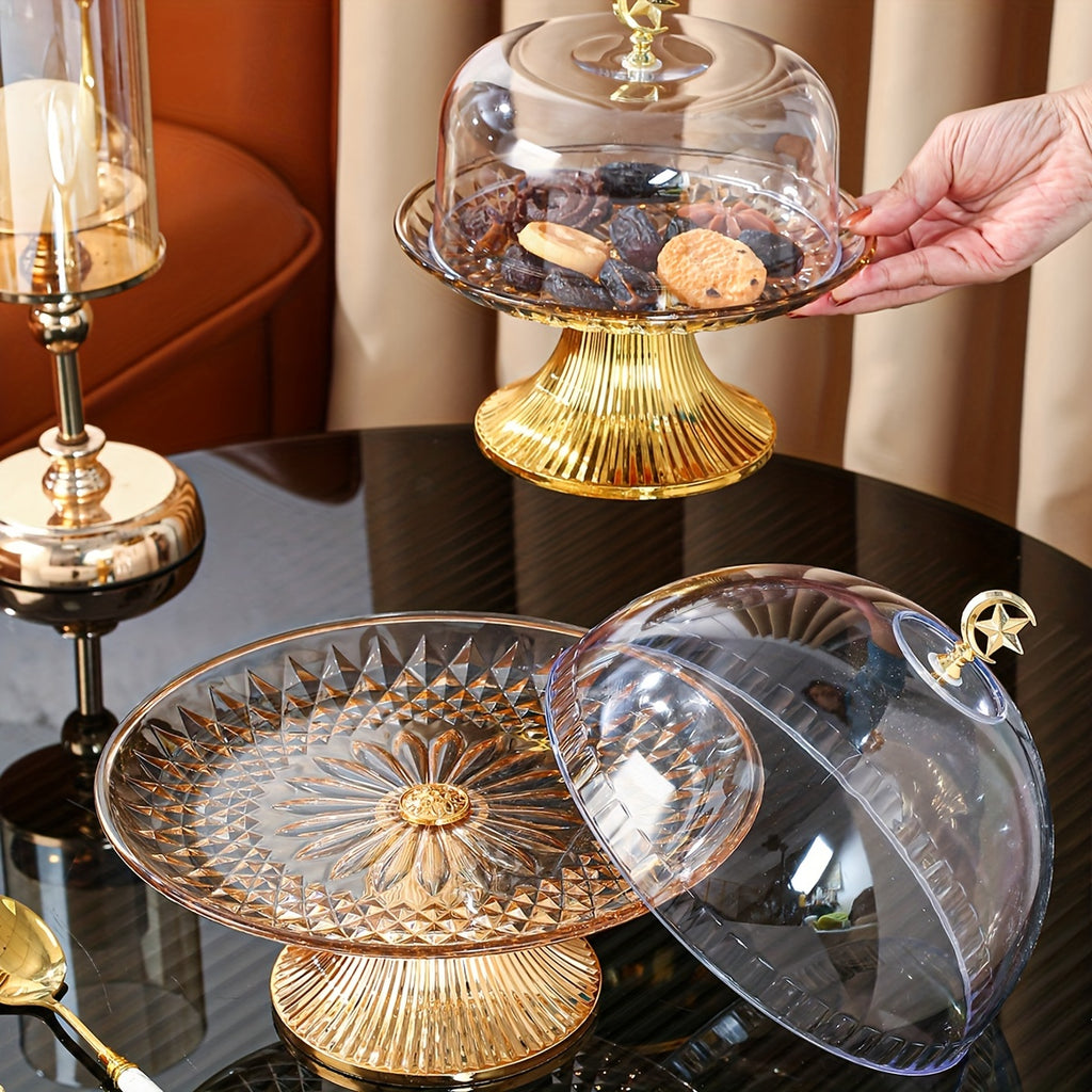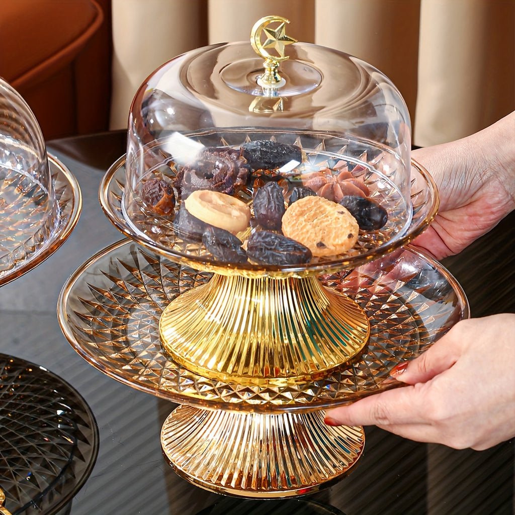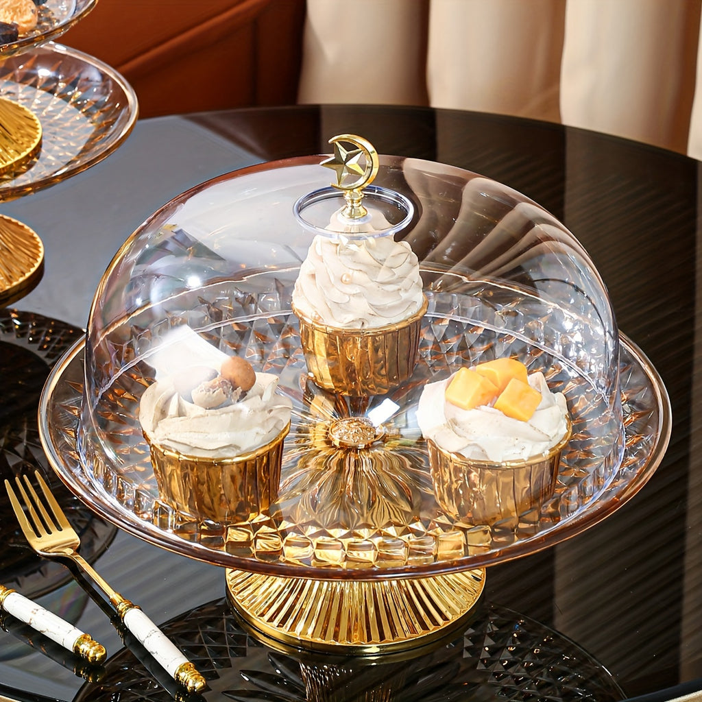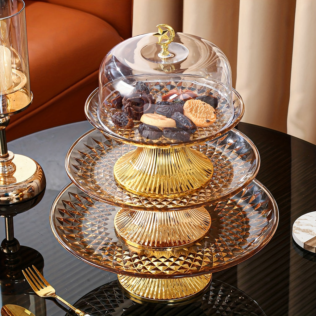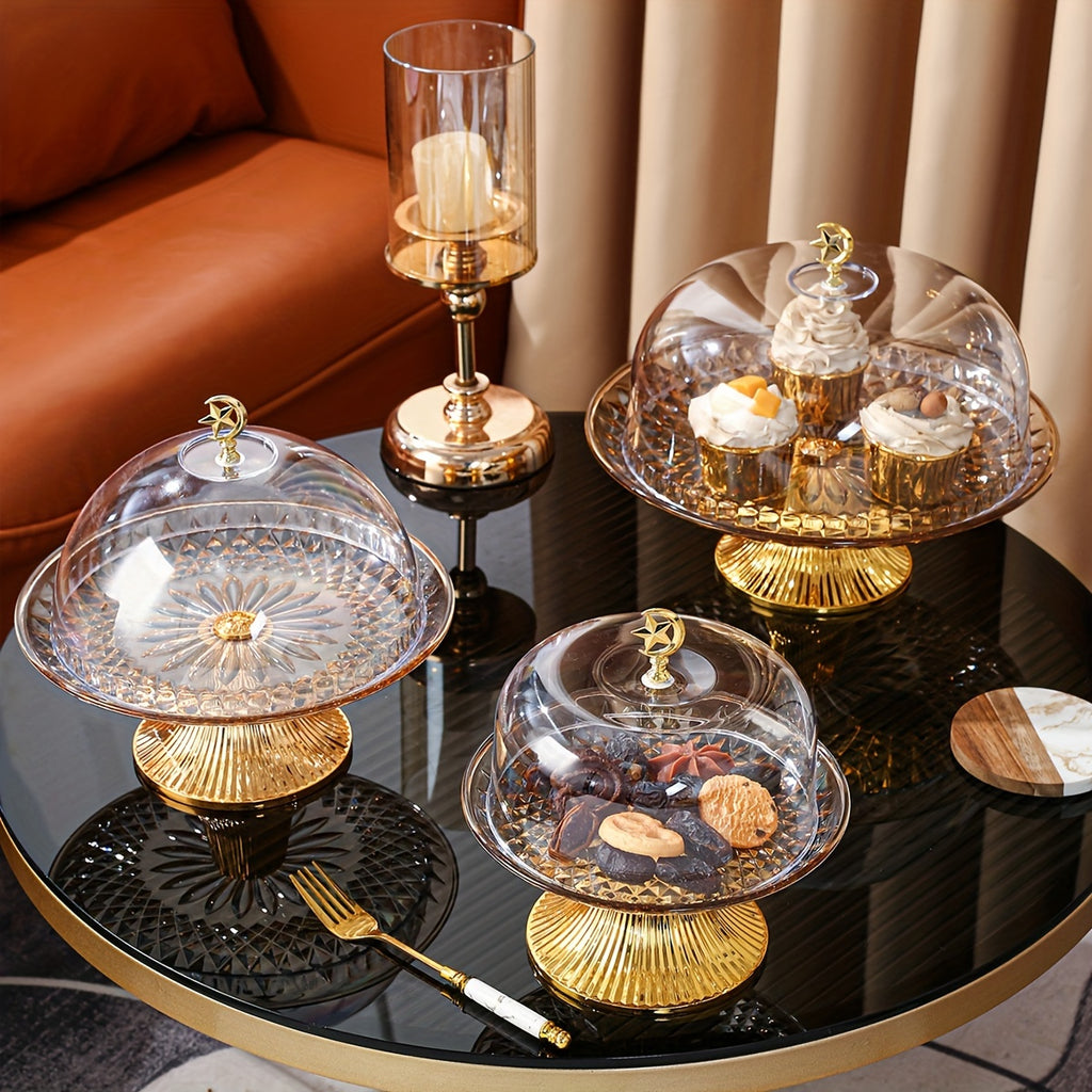 Apresente seus bolos, doces e frutas com sofisticação e estilo! Este conjunto nórdico de 3 bandejas com base dourada e tampas em domo é perfeito para manter seus alimentos protegidos e visíveis, seja em festas, cafés ou eventos especiais.