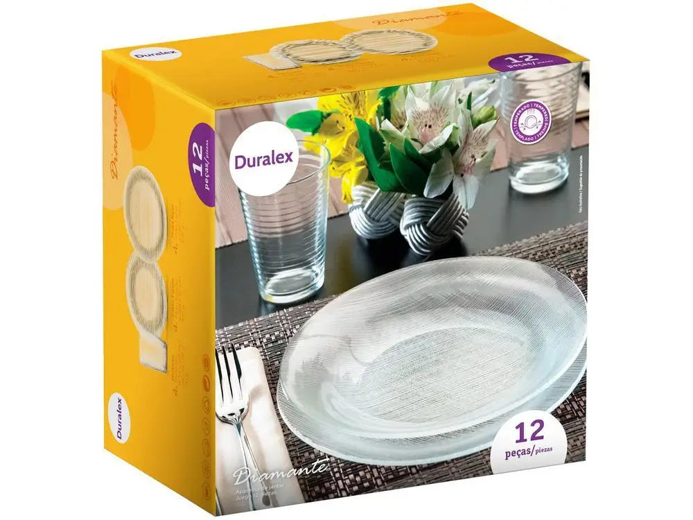 💎 APARELHO DE JANTAR 12 PEÇAS EM VIDRO DIAMANTE – Elegância Atemporal para Sua Mesa!