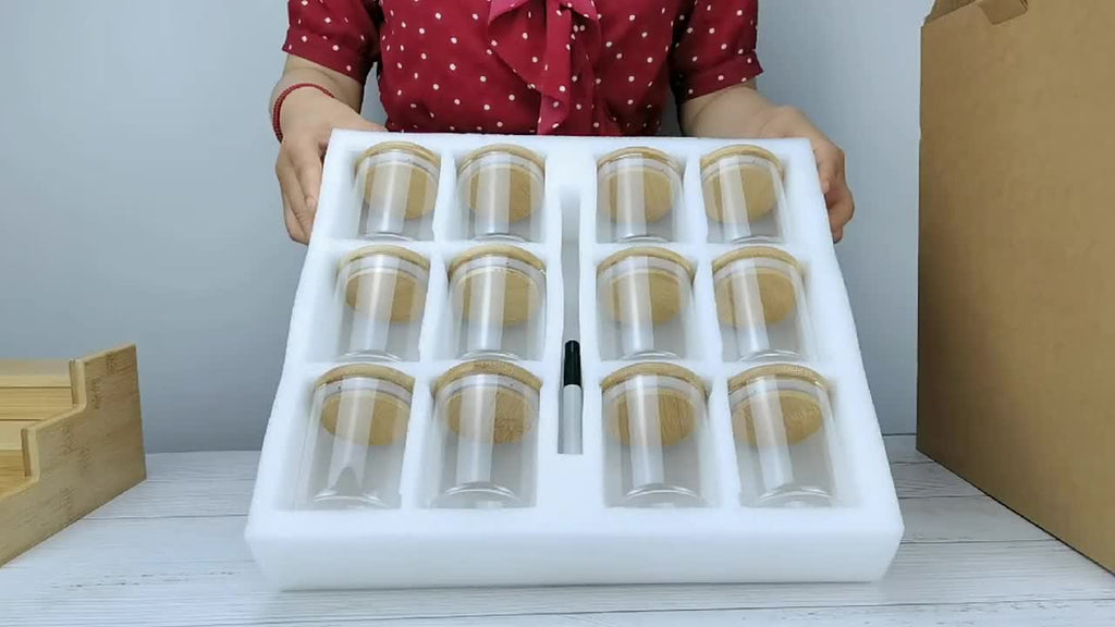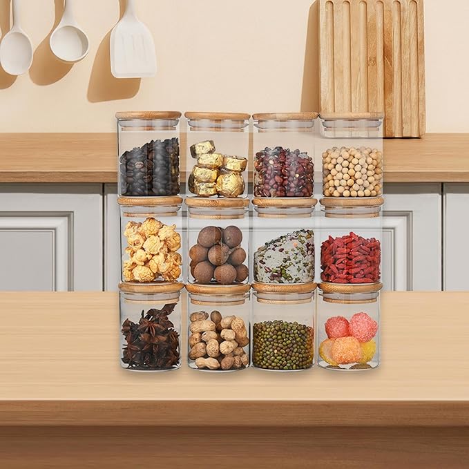 🌿 CONJUNTO DE 12 POTES DE ARMAZENAMENTO COM TAMPA DE BAMBU 240ML – Organize com Estilo e Sustentabilidade!
