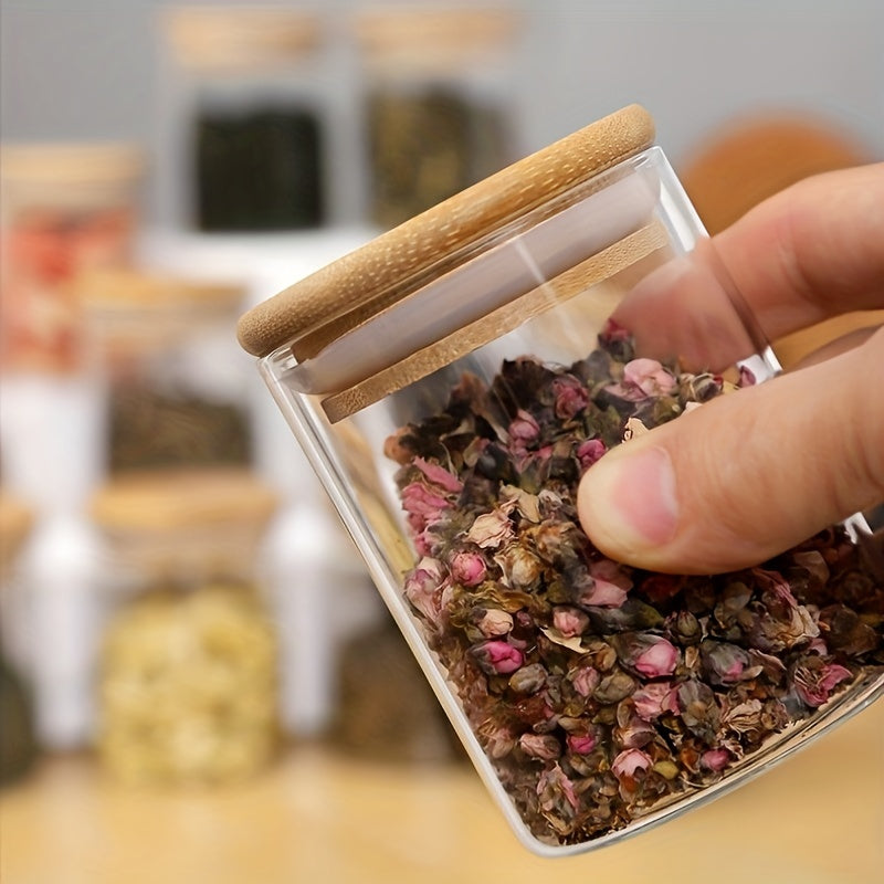 Mantenha seus ingredientes frescos, visíveis e protegidos em potes de vidro elegantes com tampas de bambu – perfeitos para cozinhas modernas!