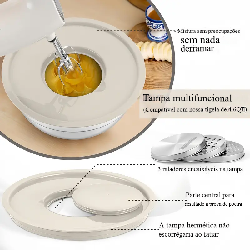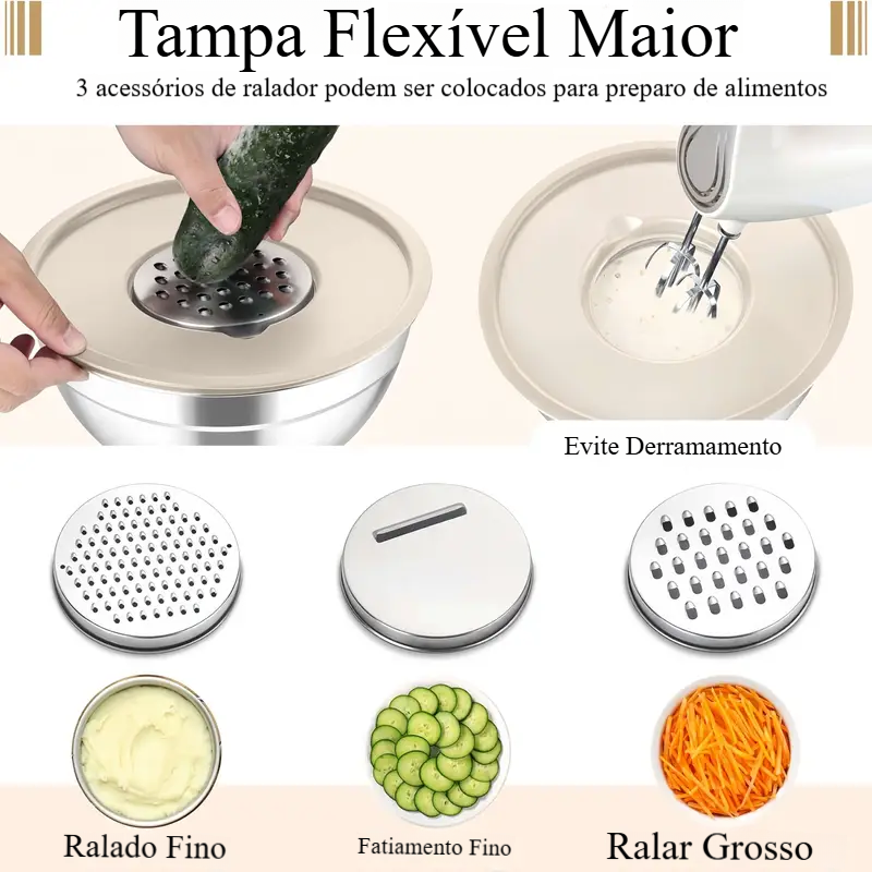 ✅ 15 Peças Inclusas – Tigelas + tampas + 3 acessórios de ralador (fino, médio e grosso)