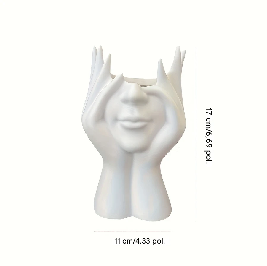 Dê um toque único ao seu espaço de beleza com este organizador criativo em formato de jovem segurando o rosto – perfeito para guardar pincéis, canetas ou como peça decorativa cheia de estilo!