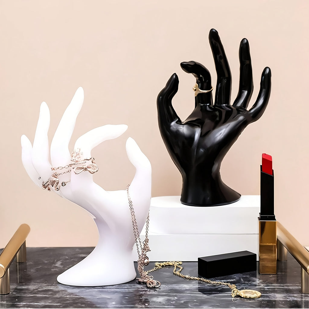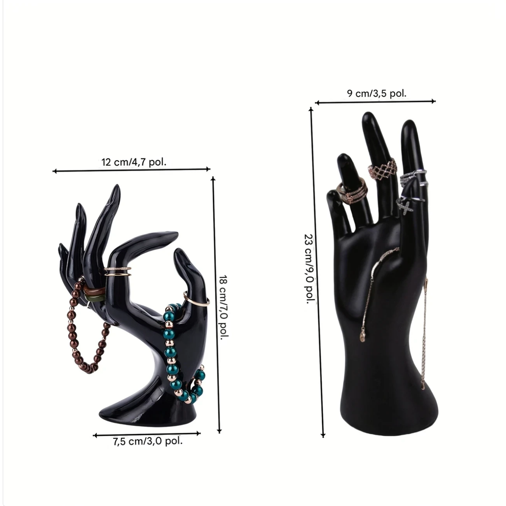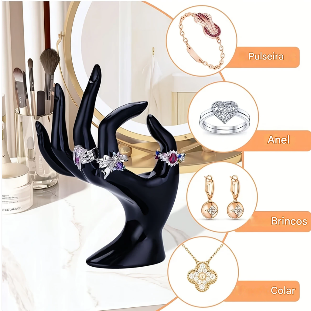 Destaque suas joias com sofisticação e estilo usando este suporte em formato de mão, perfeito para exibir anéis, pulseiras e colares de maneira chique e minimalista. Ideal para quem valoriza organização com um toque de design moderno!