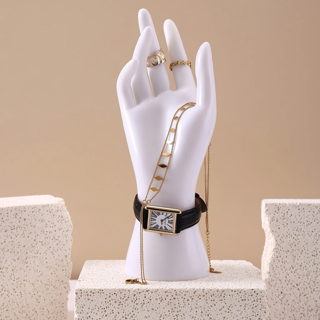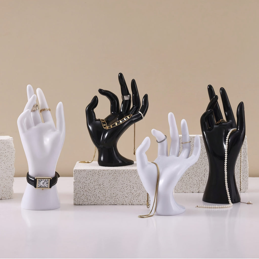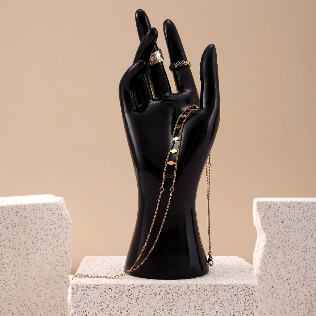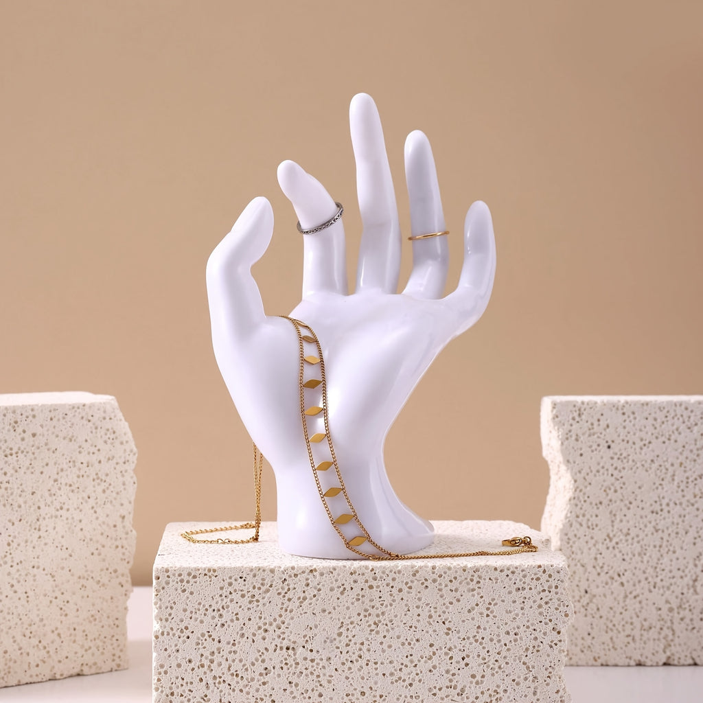 Destaque suas joias com sofisticação e estilo usando este suporte em formato de mão, perfeito para exibir anéis, pulseiras e colares de maneira chique e minimalista. Ideal para quem valoriza organização com um toque de design moderno!