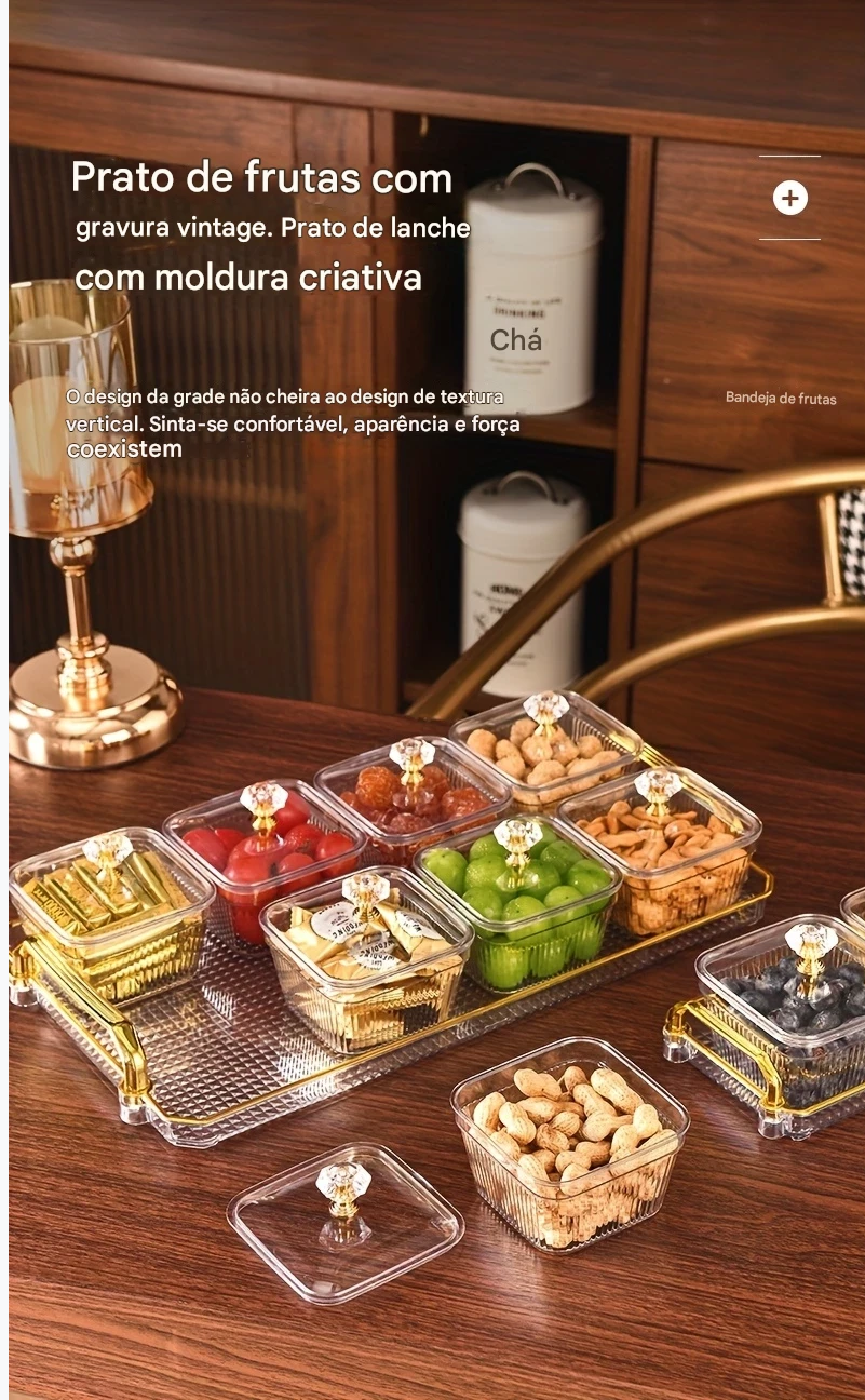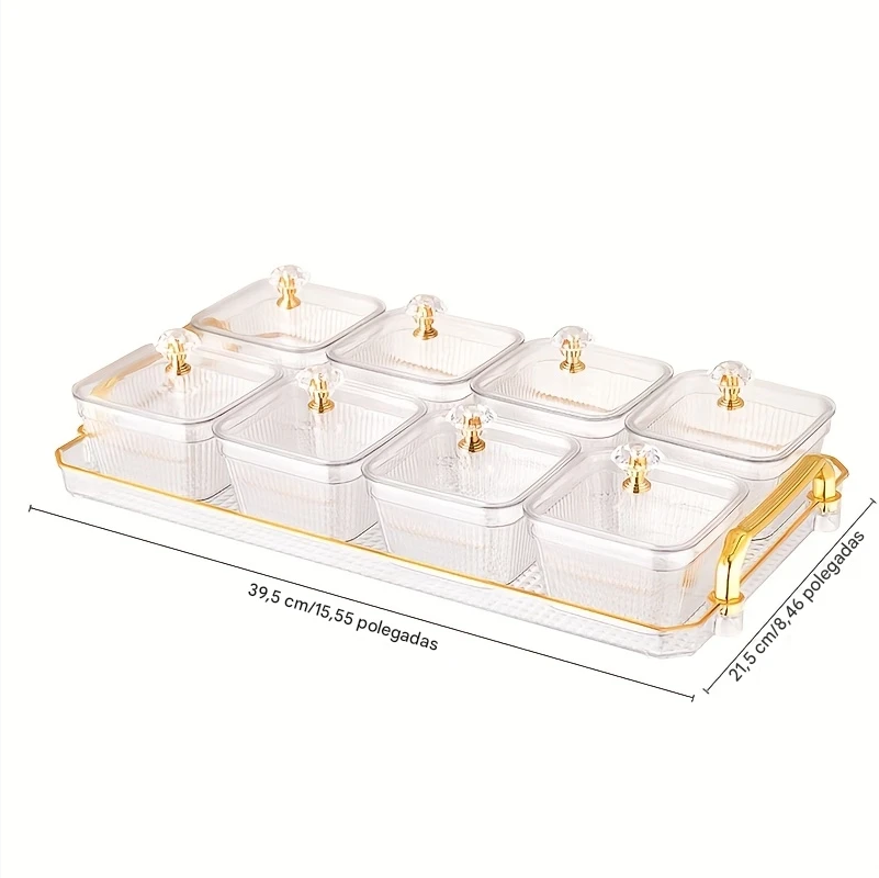 Mantenha seus lanches e aperitivos perfeitamente organizados com este tabuleiro 8 em 1! Ideal para festas, eventos ou até para o dia a dia, ele oferece compartimentos removíveis e tampas práticas para levar apenas o que você precisa.