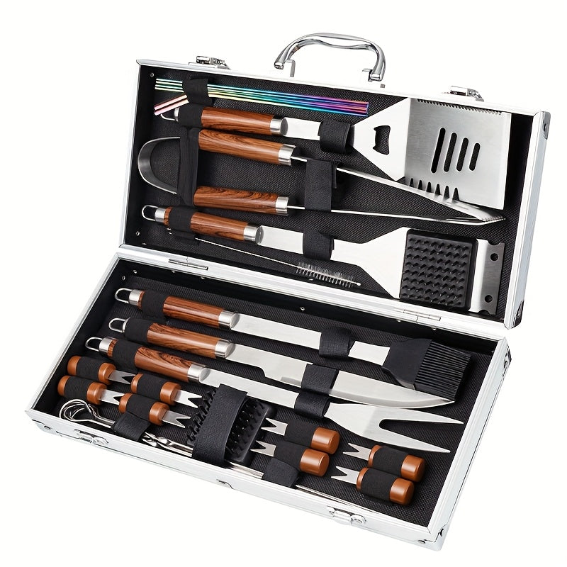 Este kit profissional de 25 peças inclui todas as ferramentas essenciais para um churrasco impecável, desde pinças e espátulas até espetos e suportes de milho. Perfeito para iniciantes e experts, com design ergonômico e resistente para uso intensivo.