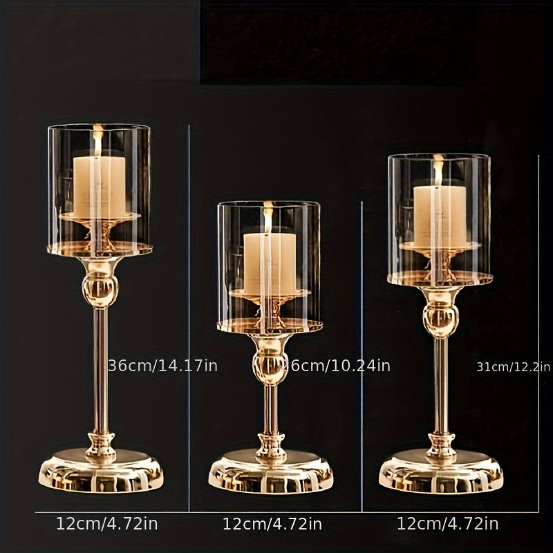 Este exclusivo conjunto de 3 castiçais em metal dourado e vidro traz elegância e um toque romântico para sua decoração. Perfeito para criar ambientes aconchegantes em jantares, eventos ou no dia a dia.