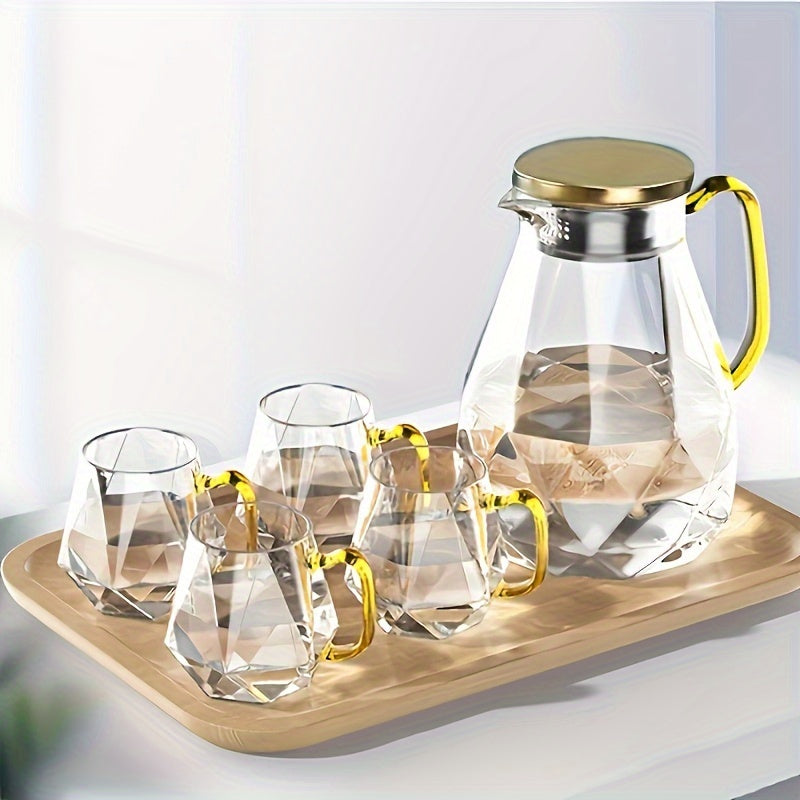 Este exclusivo conjunto de jarra + 4 copos combina design sofisticado em corte diamante com alta resistência térmica, perfeito para chás, águas aromatizadas, café e muito mais. A tampa dourada e alça moderna trazem um toque de luxo à sua mesa.