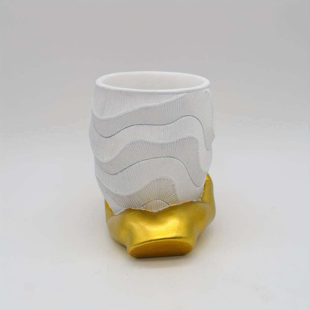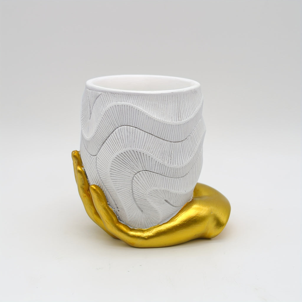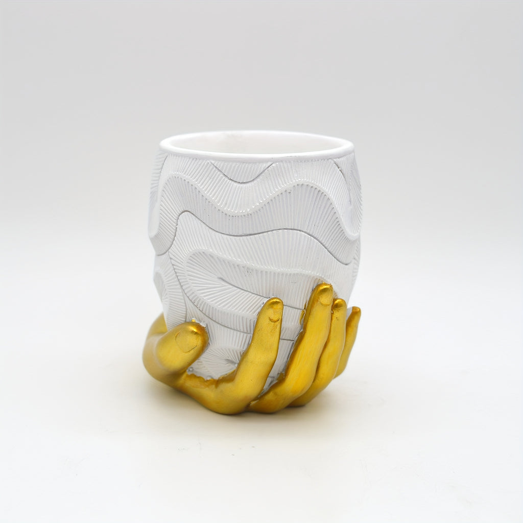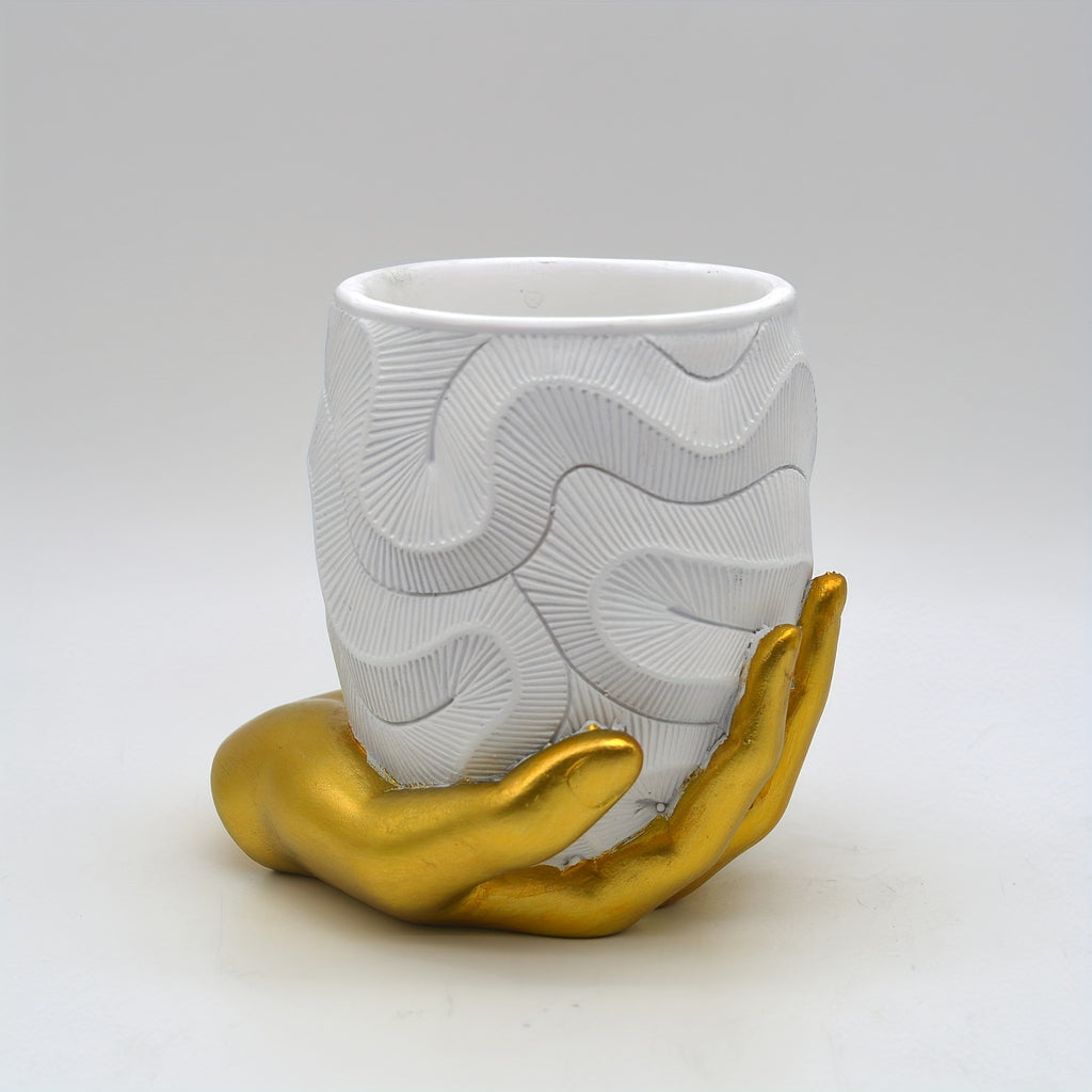 Adicione um toque de sofisticação e originalidade ao seu escritório ou banheiro com este porta canetas em resina dourada, apoiado em uma delicada estrutura em formato de mão. Perfeito para organizar canetas, pincéis de maquiagem ou acessórios pequenos com muito estilo!